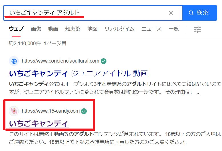 検索結果の上から2番目のサイトが、いちごキャンディの本物の公式サイトです。(順位はその時によって変わります)